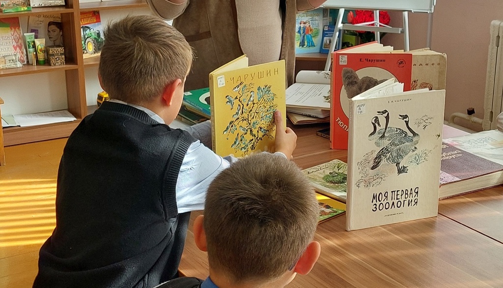 Библиотекарь читального зала Ольга Зуева познакомила школьников с биографией и творчеством писателя-анималиста. С помощью книг Е.Чарушина ребята узнали, как птицы и животные воспитывают своих детёнышей, учились по описанию и иллюстрациям узнавать животных разных стран и континентов. Закончилась встреча просмотром мультипликационного фильма о животных.
