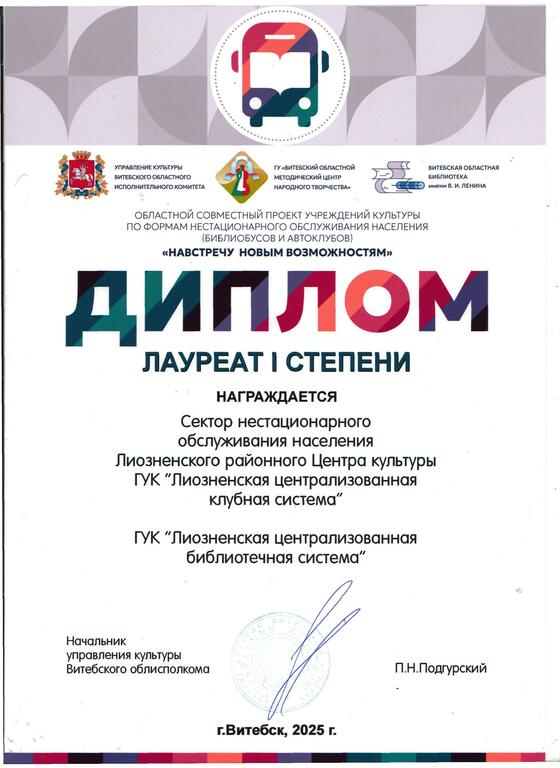 2 октября директор ГУК «Лиозненская ЦБС» Марина Бондарева и библиотекарь отдела обслуживания и информации центральной районной библиотеки Татьяна Пискунова приняли участие в методическом дне областного совместного проекта учреждений культуры по формам нестационарного обслуживания населения (автоклубов и библиобусов) ”Навстречу новым возможностям“.