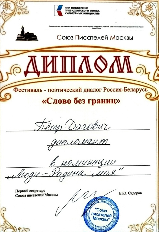 Пётр Дагович стал дипломантом конкурса в номинации «Люди – Родина моя». Специальными призами конкурса были награждены Ольга Печёнова («За откровенность поэтического чувства») и Татьяна Селезнёва («За верность исторической памяти»).