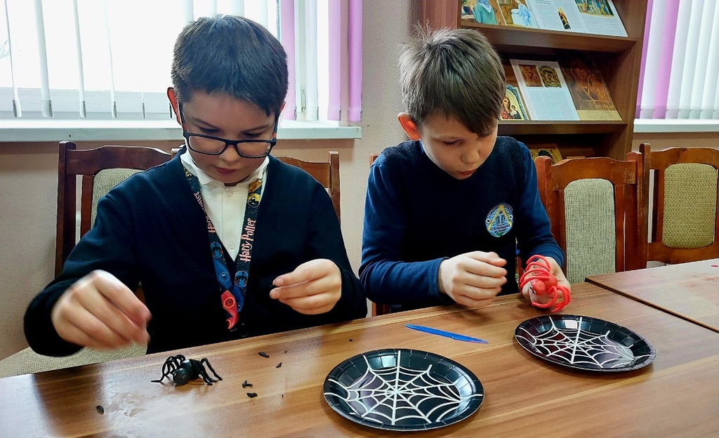 Ребятам предстояло окунуться в мир литературы, искусства и анимации, чтобы больше узнать о пауках, о пользе их в природе, изучить их повадки и анатомические особенности. Школьники слушали легенду Древней Греции об Арахне, в честь которой были названы пауки, вспоминали сказку К.Чуковского «Муха-Цокотуха» и мультфильм «Лунтик», узнали, почему нить паутины самая крепкая на планете, а в завершении мероприятия слепили доброго домашнего паучка из пластилина.